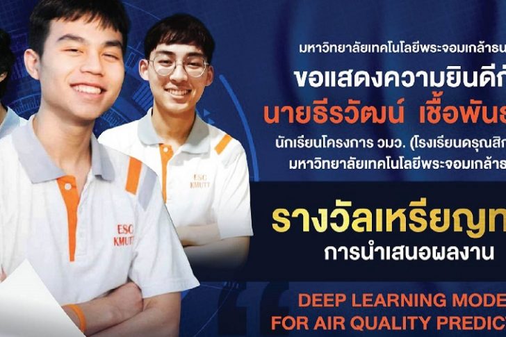 “ดีหรือไม่หากสามารถพยากรณ์ค่าฝุ่น PM2.5 ในแต่ละวันในพื้นที่ต่างๆ ได้” จุดเริ่มต้นไอเดียผลงานแก้ไขปัญหาสิ่งแวดล้อม “DEEP LEARNING MODEL FOR AIR QUALITY PREDICTION” นวัตกรรมสร้างสรรค์ใช้เทคโนโลยีปัญญาประดิษฐ์ หรือ AI ในการสร้างแบบจำลองการทำนายค่าฝุ่น PM2.5 เพื่อประเมินสภาวะอากาศในแต่ละพื้นที่ พัฒนาโดย นายธีรวัฒน์ เชื้อพันธ์งาม นายวสุพล เฮงศรีธวัช และนายกฤติน ถิระศักดิ์ นักเรียนชั้นมัธยมศึกษาปีที่ 6 โครงการสนับสนุนการจัดตั้งห้องเรียนวิทยาศาสตร์ในโรงเรียน (วมว.) โรงเรียนดรุณสิกขาลัย โดยการกำกับดูแลของมหาวิทยาลัยเทคโนโลยีพระจอมเกล้าธนบุรี (มจธ.) โดยมีอาจารย์ที่ปรึกษา ดร.เอกพงษ์ หิรัญสิริสวัสดิ์ สำนักงานห้องเรียนวิศว์-วิทย์ และดร.ธีรสิทธิ์ เติมสายทอง สถาบันการเรียนรู้ มจธ. 1 ใน 6 ผลงานตัวแทนประเทศไทยนำเสนอผลงานในการประชุมวิชาการนานาชาตินักวิทยาศาสตร์รุ่นเยาว์ครั้งที่ 28 ที่ได้รับการคัดเลือกจากผลงานที่ส่งเข้าร่วมจำนวนกว่า 25 โครงงาน จากโรงเรียนบ่มเพาะนักวิทยาศาสตร์ทั่วประเทศ โดยแบ่งตามกลุ่มสาขา เช่น สาขาวิทยาการคอมพิวเตอร์ สาขาคณิตศาสตร์ สาขาฟิสิกส์ สาขาสิ่งแวดล้อม…