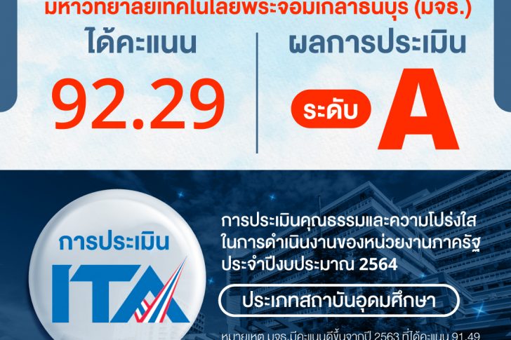 มหาวิทยาลัยเทคโนโลยีพระจอมเกล้าธนบุรี (มจธ.) ได้คะแนน 92.29 ผลการประเมินระดับ A การประเมินคุณธรรมและความโปร่งใสในการดำเนินงานของหน่วยงานภาครัฐ (ITA) ประจำปีงบประมาณ 2564 ประเภทสถาบันอุดมศึกษา โดย สำนักงาน ป.ป.ช.