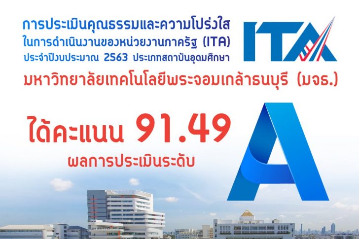 มหาวิทยาลัยเทคโนโลยีพระจอมเกล้าธนบุรี (มจธ.) ได้คะแนน 91.49 ผลการประเมินระดับ A การประเมินคุณธรรมและความโปร่งใสในการดำเนินงานของหน่วยงานภาครัฐ (ITA) ประจำปีงบประมาณ 2563 ประเภทสถาบันอุดมศึกษา โดย สำนักงาน ป.ป.ช.