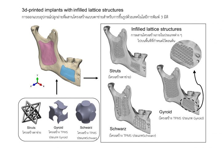ในปัจจุบันเทคโนโลยีการพิมพ์ 3 มิติเข้ามามีบทบาทและเป็นทางเลือกให้กับการผลิตชิ้นส่วนต่างๆ สำหรับการใช้งานในหลายๆ รูปแบบ อาทิ ชิ้นส่วนยานยนต์ ชิ้นส่วนอากาศยาน และการผลิตชิ้นส่วนใช้งานทางการแพทย์ เป็นต้น ซึ่งการผลิตชิ้นงานด้วยเทคโนโลยีการพิมพ์ 3 มิตินั้น ยังสามารถเพิ่มมูลค่าให้กับชิ้นงานที่ผลิตได้อย่างมากอีกด้วย ดร.พชรพิชญ์ พรหมอุปถัมภ์ อาจารย์ประจำภาควิชาวิศวกรรมเครื่องกล คณะวิศวกรรมศาสตร์ มหาวิทยาลัยเทคโนโลยีพระจอมเกล้าธนบุรี (มจธ.) กล่าวว่า เทคโนโลยีการพิมพ์ 3 มิติ ไม่ใช่เรื่องใหม่ใน ประเทศซีกโลกตะวันตกที่ได้มีการนำเทคโนโลยีนี้มาใช้ประโยชน์เชิงพาณิชย์อย่างแพร่หลายในวัตถุประสงค์ต่าง ๆ ซึ่งโดยมากมักใช้ในการผลิตชิ้นส่วนอากาศยานที่ต้องการชิ้นส่วนที่มีรูปร่างซับซ้อนและต้องการความแม่นยำในการผลิตสูง จึงเล็งเห็นว่าเป็นเทคโนโลยีที่สามารถนำมาปรับใช้ในการผลิตชิ้นส่วนอุปกรณ์ปลูกถ่ายที่ใช้ทางการแพทย์เพื่อเป็นทางเลือกในการรักษาให้กับผู้ป่วยในประเทศไทยได้ ด้วยความเชี่ยวชาญในด้านกลศาสตร์ของวัสดุ ที่เป็นแขนงวิชาหนึ่งในด้านวิศวกรรมศาสตร์ จึงได้เริ่มต้นศึกษาวิจัยการนำเทคโนโลยีการพิมพ์ 3 มิติมาใช้ในการผลิตอุปกรณ์ปลูกถ่ายประเภทโลหะสำหรับผู้ป่วยที่จำเป็นต้องปลูกถ่ายกระดูก เพื่อเป็นอีกหนึ่งทางเลือกที่จะสามารถพัฒนาให้ผู้ป่วยได้รับการรักษาที่มีประสิทธิภาพมากยิ่งขึ้น เนื่องจากการผลิตแผ่นกระดูกเทียมจะมีโครงสร้างบางอย่างที่ไม่สามารถออกแบบและผลิตได้โดยง่ายเพราะมีรูปแบบเฉพาะ ดังนั้นการนำเทคโนโลยีการพิมพ์ 3 มิติมาปรับใช้จะทำให้การผลิตอุปกรณ์ปลูกถ่ายประเภทโลหะได้อุปกรณ์ที่มีขนาดและรูปร่างเฉพาะสำหรับผู้ป่วยแต่ละบุคคลได้และมีประสิทธิภาพในการรักษามากยิ่งขึ้น โดยการศึกษาวิจัยต้องอาศัยการทำงานร่วมกับอาจารย์แพทย์ที่มีความเชี่ยวชาญ ซึ่งปัจจุบันมีความร่วมมือกับคณะทันตแพทยศาสตร์ จุฬาลงกรณ์มหาวิทยาลัย ภายใต้โครงการศึกษา อุปกรณ์ปลูกถ่ายประเภทโลหะจากเครื่องพิมพ์ 3 มิติ นั้น ประกอบด้วยโครงการวิจัยย่อยหลายโครงการซึ่งดำเนินการคู่ขนานกันไป ซึ่งหนึ่งในโครงการนั้น ได้แก่ โครงการการเพิ่มประสิทธิภาพของโครงสร้างภายในจากการคำนวณขั้นสูง ซึ่งเป็นโครงการศึกษาวิจัยเพื่อพัฒนาซอฟต์แวร์สำหรับวิเคราะห์โครงสร้างความพรุนและรูปแบบการโค้งของโลหะที่เหมาะสมกับโครงสร้างของกระดูกตัวอย่างที่ผ่านการทำ CT Scan…